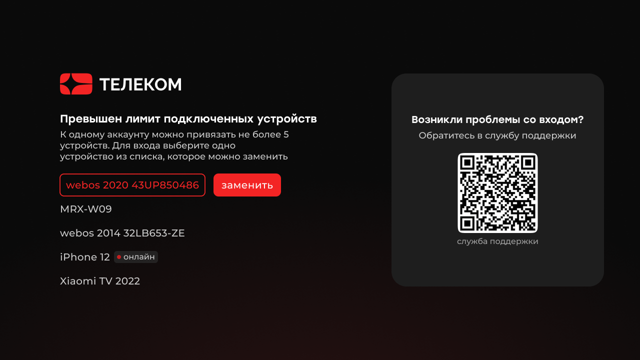 Теперь вместо ошибки «Превышено число сессий аккаунта на базовых устройствах» при авторизации абоненту будет показан новый экран с возможностью отвязать лишние устройства и попробовать войти ещё раз.